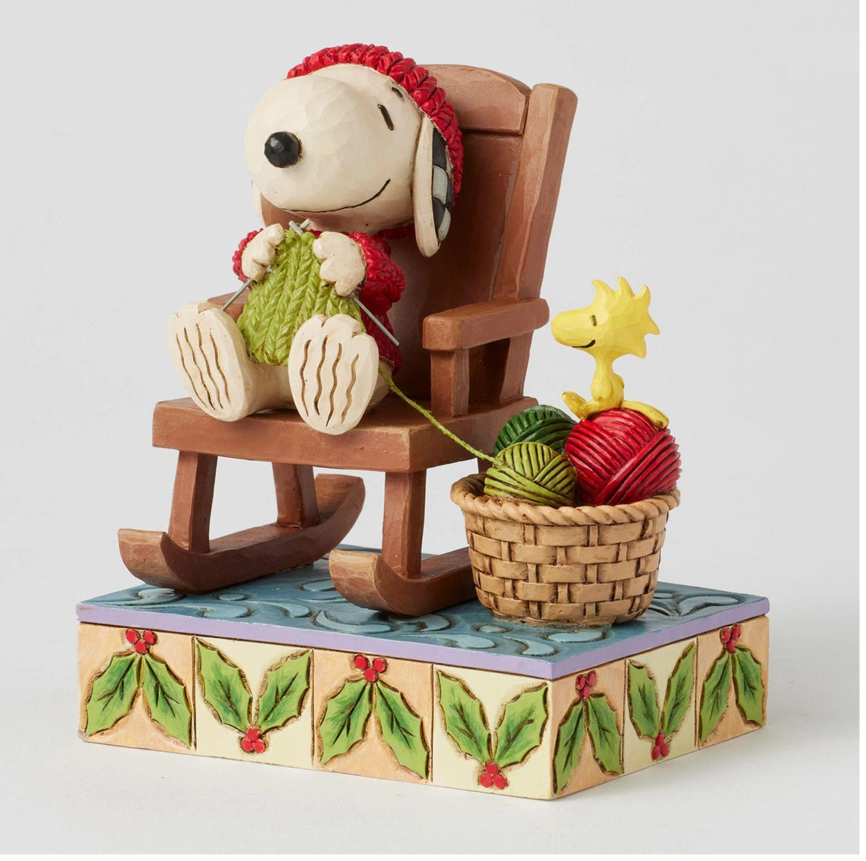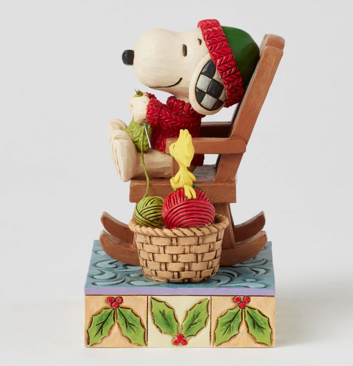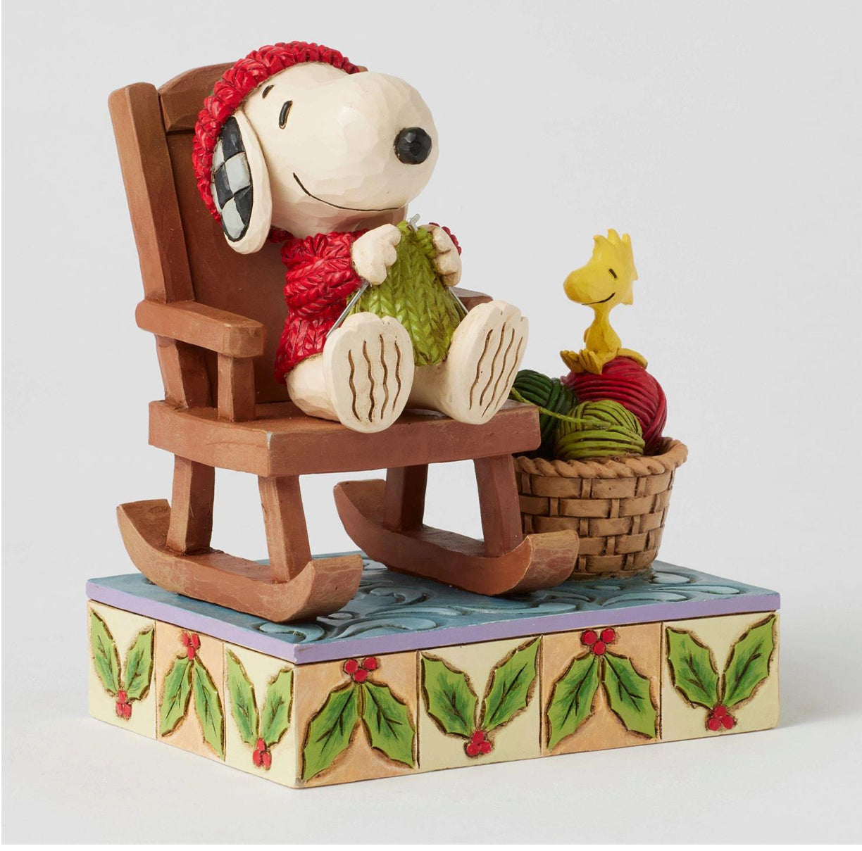 Embrace the cozy charm of the season with this delightful Jim Shore design of Snoopy sitting in a rocking chair, knitting with care. Dressed in a knit scarf and sweater, Snoopy is joined by Woodstock, who playfully assists with the balls of yarn.