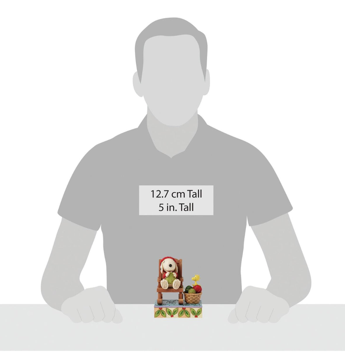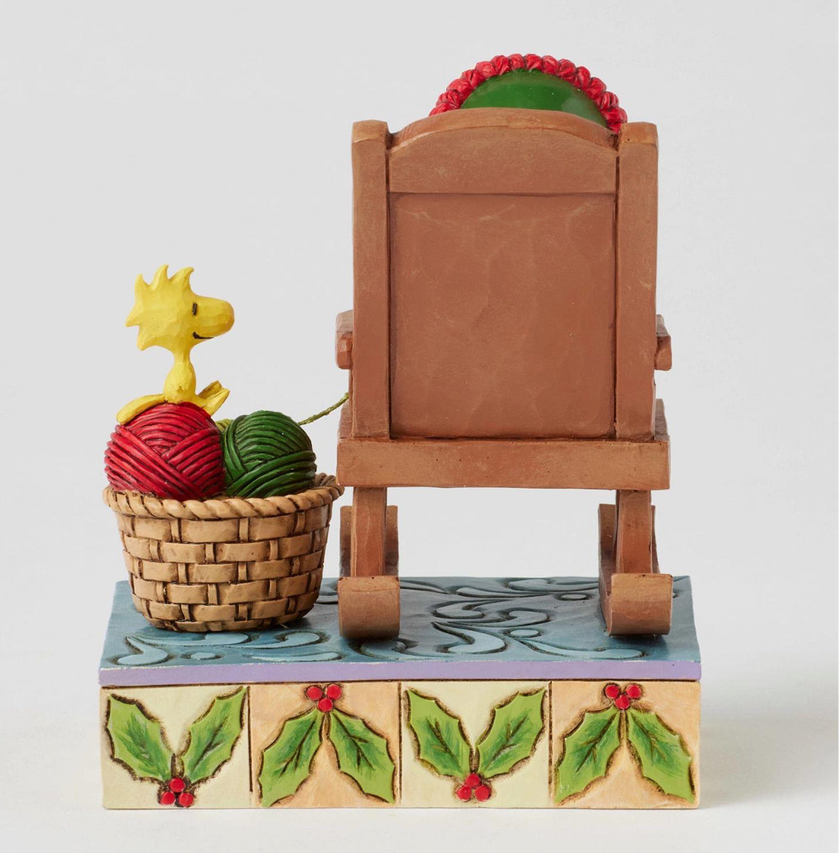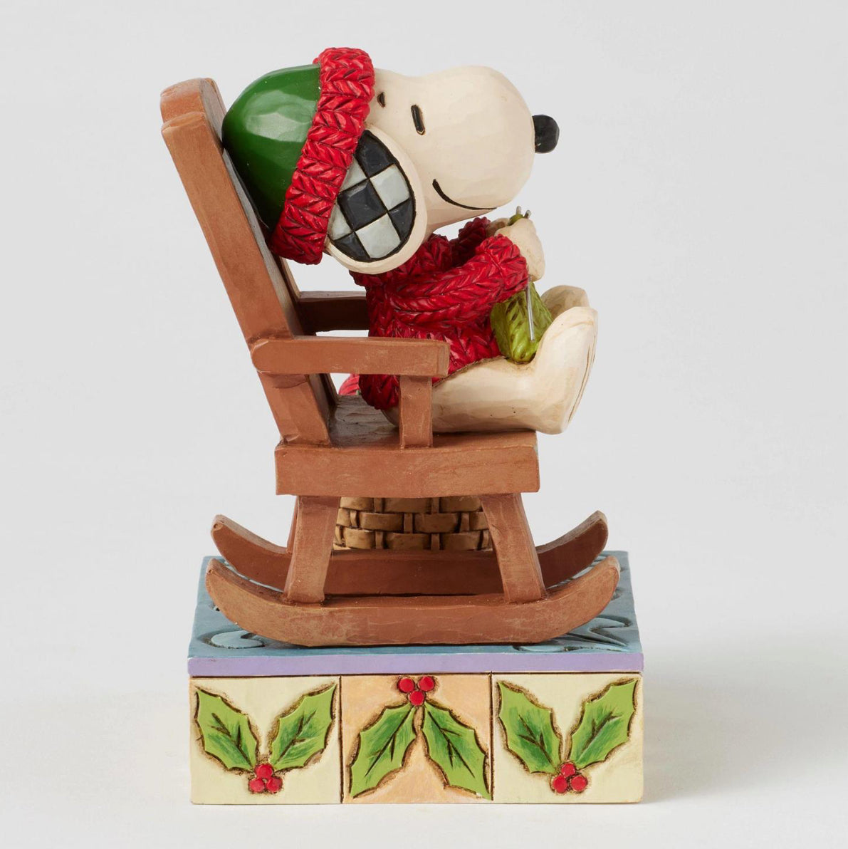 Embrace the cozy charm of the season with this delightful Jim Shore design of Snoopy sitting in a rocking chair, knitting with care. Dressed in a knit scarf and sweater, Snoopy is joined by Woodstock, who playfully assists with the balls of yarn.