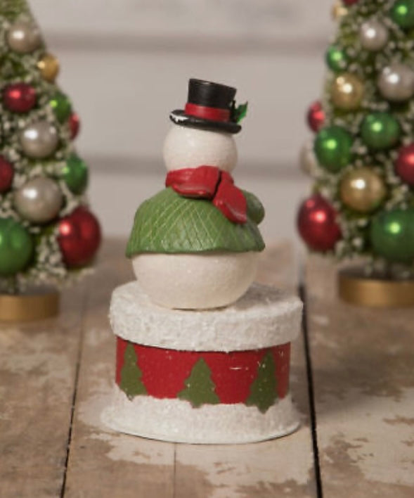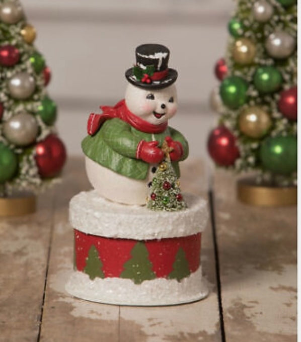 Love Vintage? This one is for you. This charming snowman is dressed in winter accessories, complete with an adorable top hat, while he decorates a little bottle brush tree. He sits on top of a hand painted paper container with snow and mica accents.