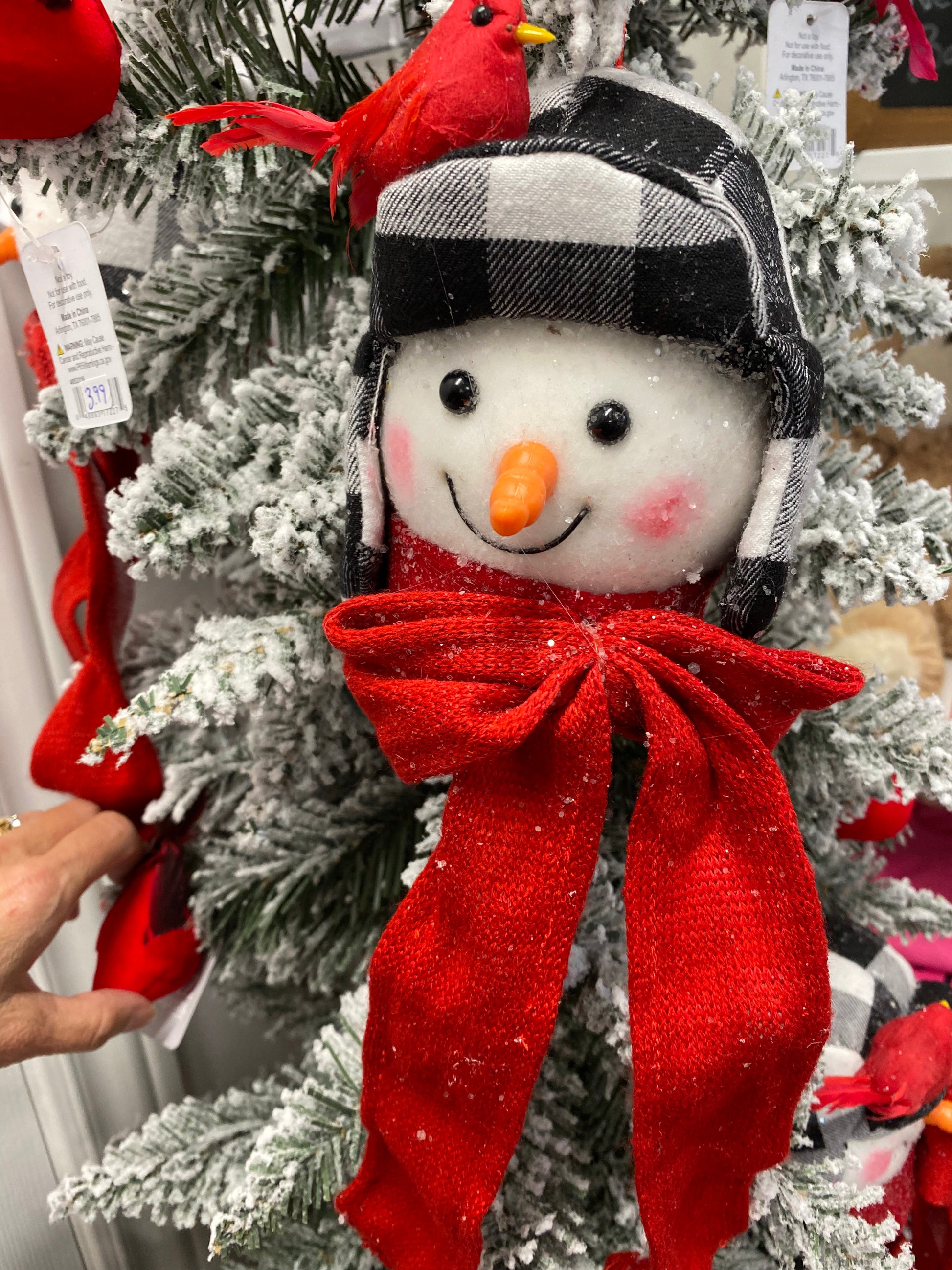 Snowman Head Ornament, snowman is covered in glitter, with back and white checked hat that features a small cardinal on top, large red bow that is glittered.