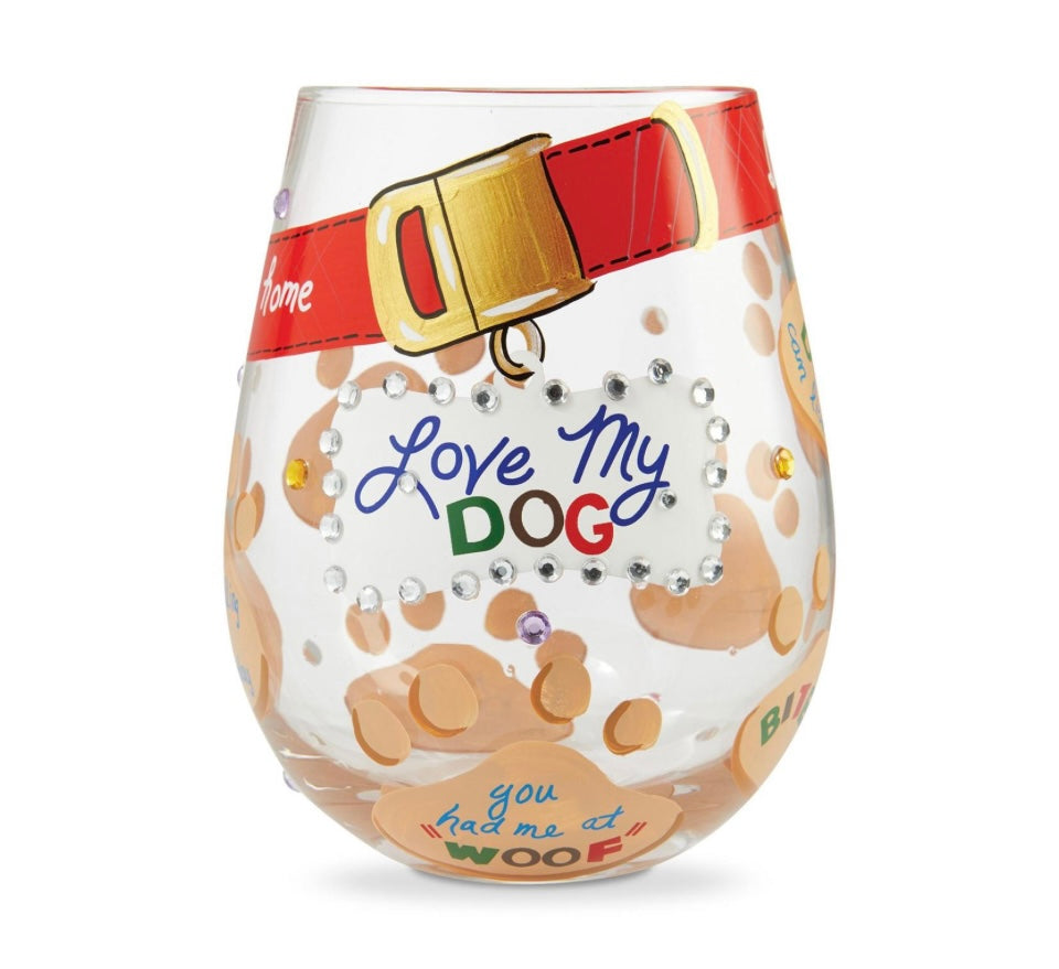 - Hand-blown "Love My Dog" wine glass from Designs by Lolita
