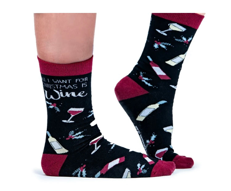 These full-bodied pair of socks have delightful notes of canny and sass. These socks pair nicely with a fully loaded cheese board and comfy sweater. Sentiment, all I want for Christmas is wine.