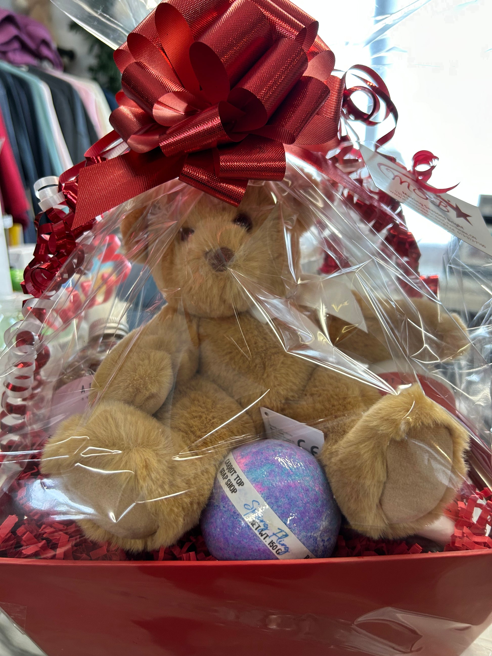 This basket contains a beautiful plush Douglas teddy bear, raspberry crush bubble bath & pomegranate hand and body lotion, Stratford ON (Apr. #6), and a bath bomb by Carrot Top Soap Shop. All decorated with cellophane, red bow, and curling ribbon.