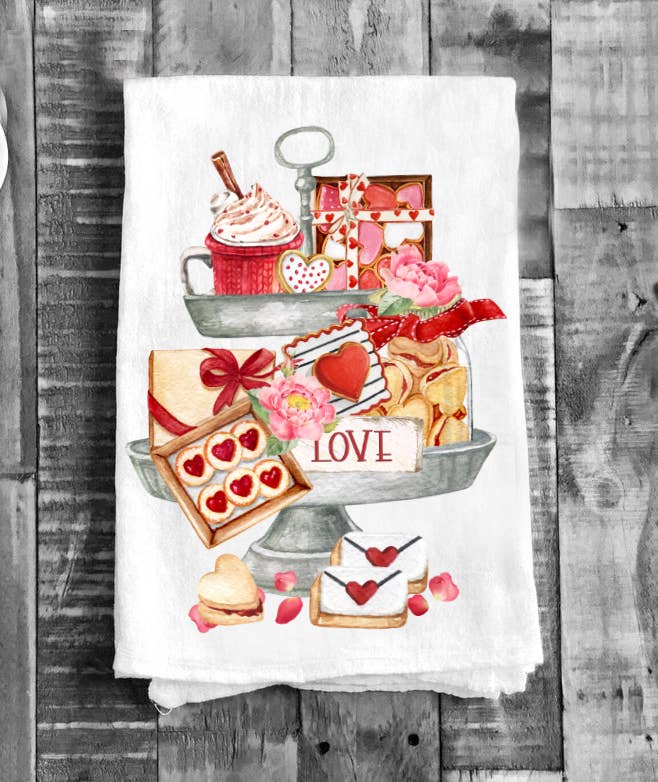 Valentine Cookies 2 Tier Tray Flour Sack Cotton Tea Towels