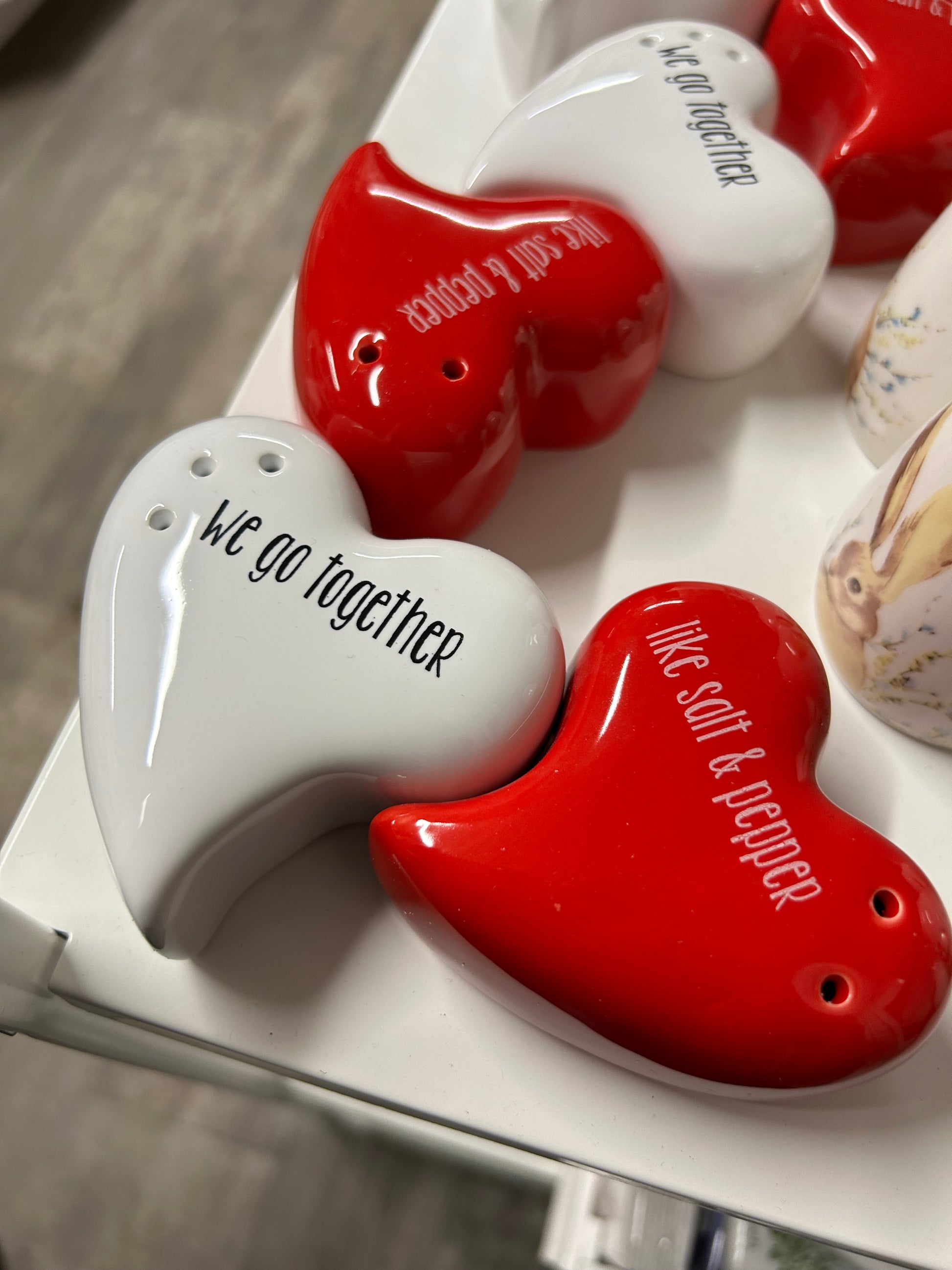 Ceramic Salt and Pepper shakers. One white, one red with Sentiment we go together like Salt and pepper. Each one is approximately 3 inch diameter.