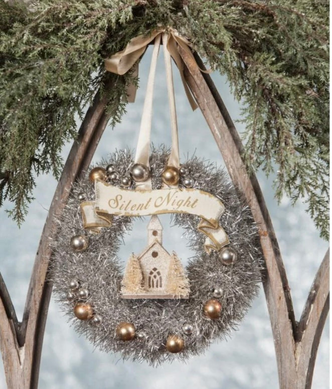 This pretty tinsel wreath sparkles with the spirit of vintage Christmas with it's "Silent Night" banner, shining gold and silver ornaments, the shining tinsel, glistening church and trees and the gorgeous ribbon. Hang in a window, on your tree or hang on an architectural frame piece, on the backs of chairs, a mirror...so many ways to display this lovely wreath.