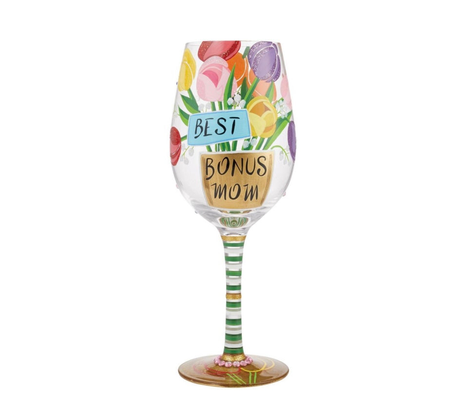 This lovely 15 oz wine glass is a marvel of color and care. This gorgeous glass will serve as a beautiful reminder of love to the extra special woman in your life. Illuminated in bright flowers, this goblet is perfect for the best bonus mom ever.