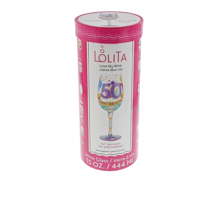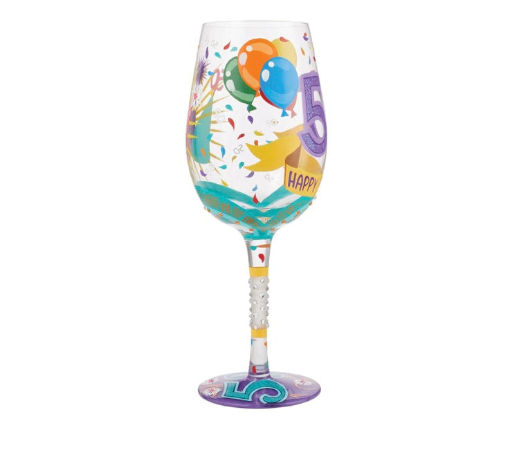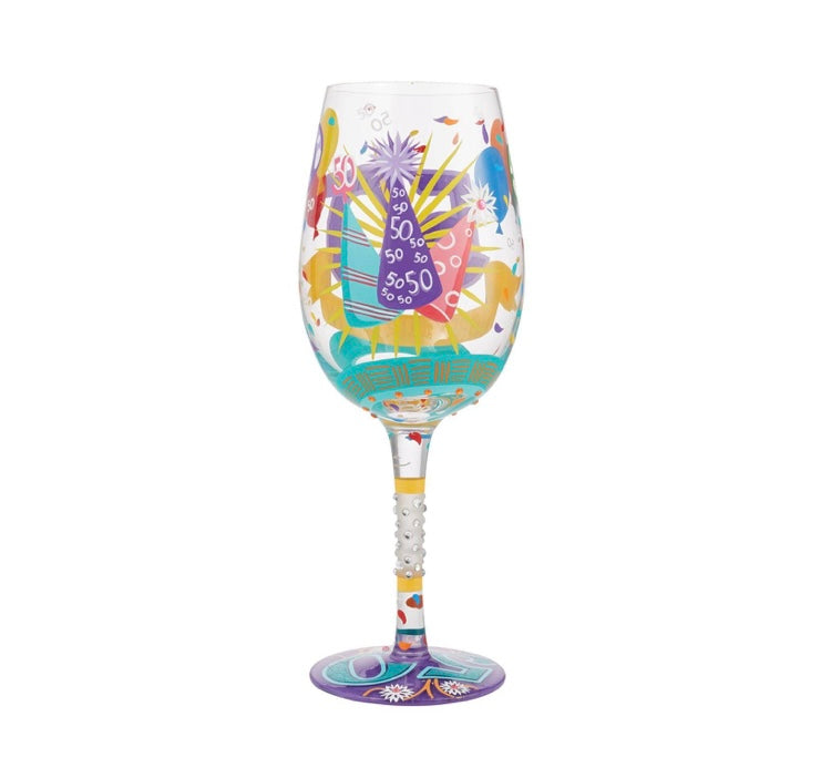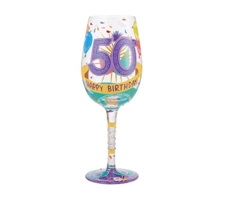 Celebrate turning 50 with a spectacle of color and class. Covered in balloons, this 15 oz capacity wine glass sparkles with birthday charisma any day of the year. Capture the milestone with this stylish sipper from Designs by Lolita, cheers to you!
