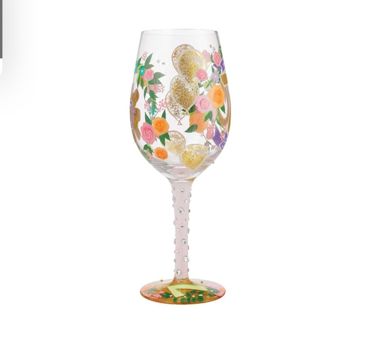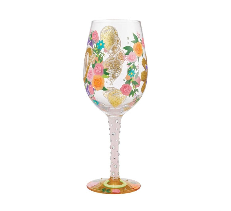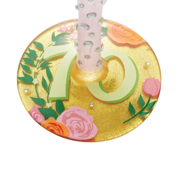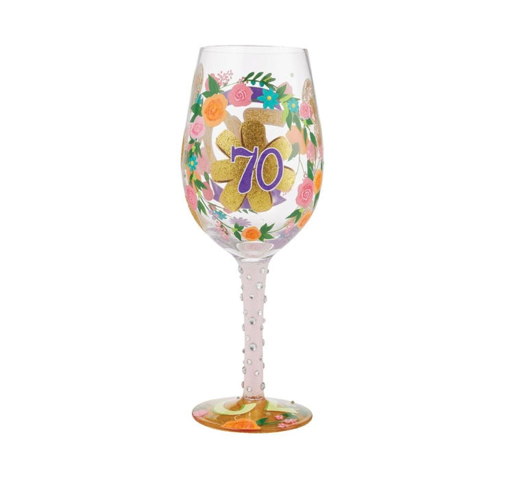 Celebrate turning 70 with a spectacle of color and calm. Fitted in flowers, this 15 oz capacity wine glass cheers with razzle and crystal bedazzle. Mark the impressive milestone with this stylish sipper for the recipient who's seventy and sultry!