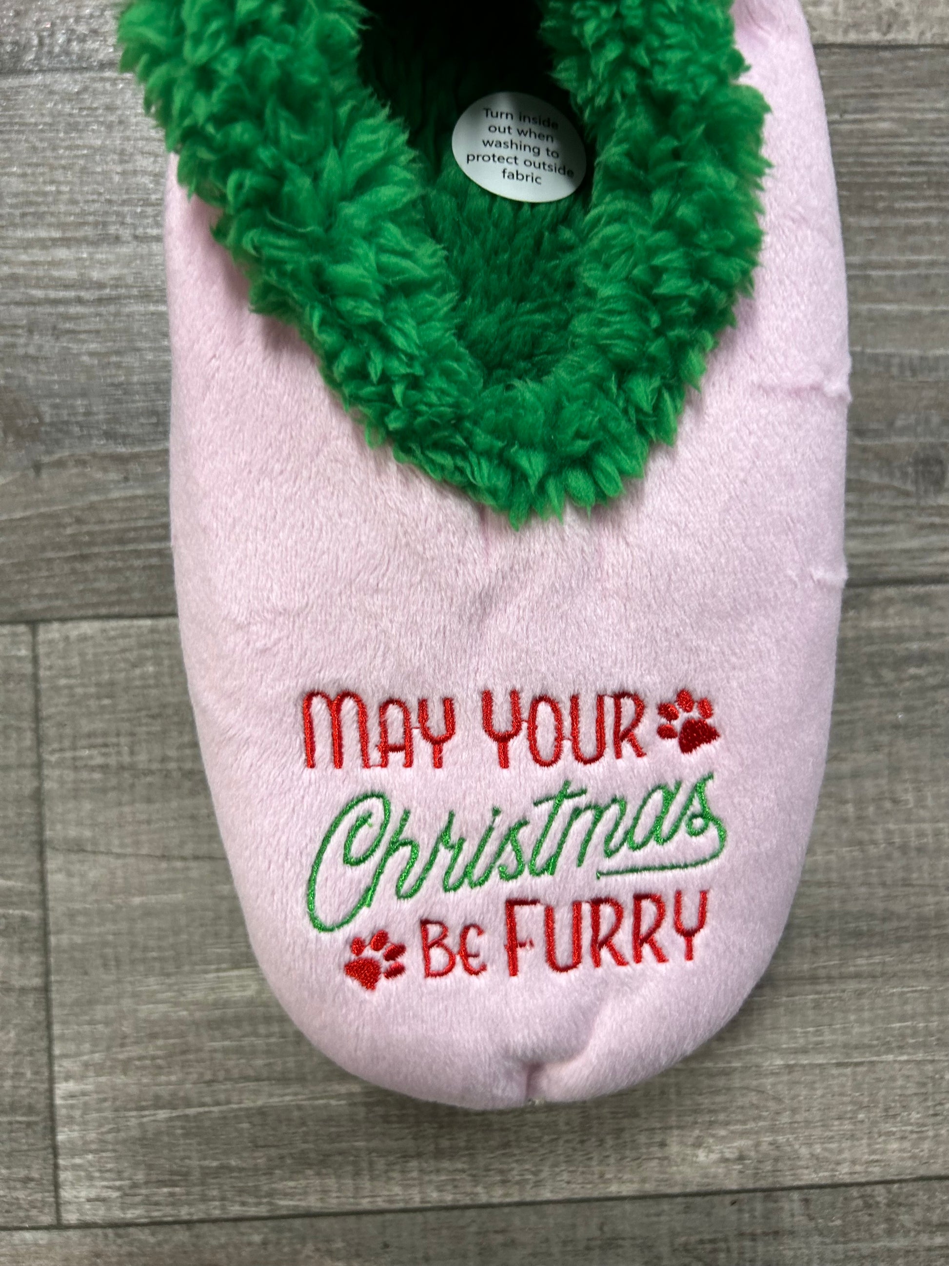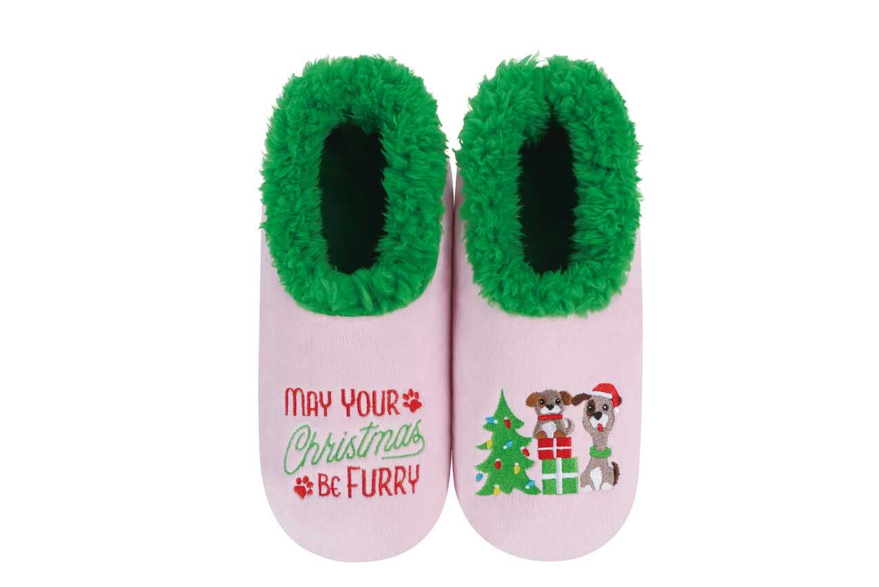 One slipper reads May your Christmas be Furry, other slipper has two dogs, tree and a present. Assorted sizes.